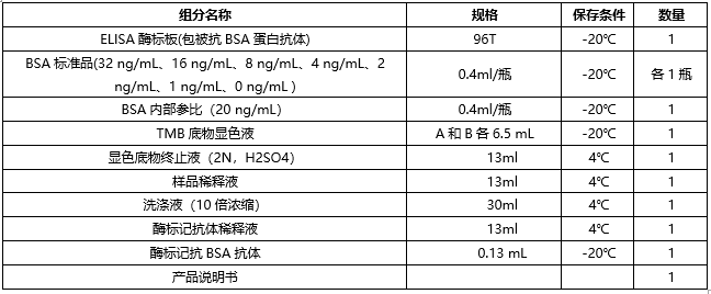 此定量检测牛血清白蛋白 (BSA) 酶联免疫试剂盒,采用抗BSA的单克隆配对抗体,分别作为包被抗体和检测抗体,组成双抗体夹心ELISA检测试剂盒,并与美国标准局的BSA标准品为参照标准,本试剂盒最低可检测到1ng/mL的BSA。使用前请仔细阅读说明书并检查试剂组分!如有疑问,请及时联系我们。